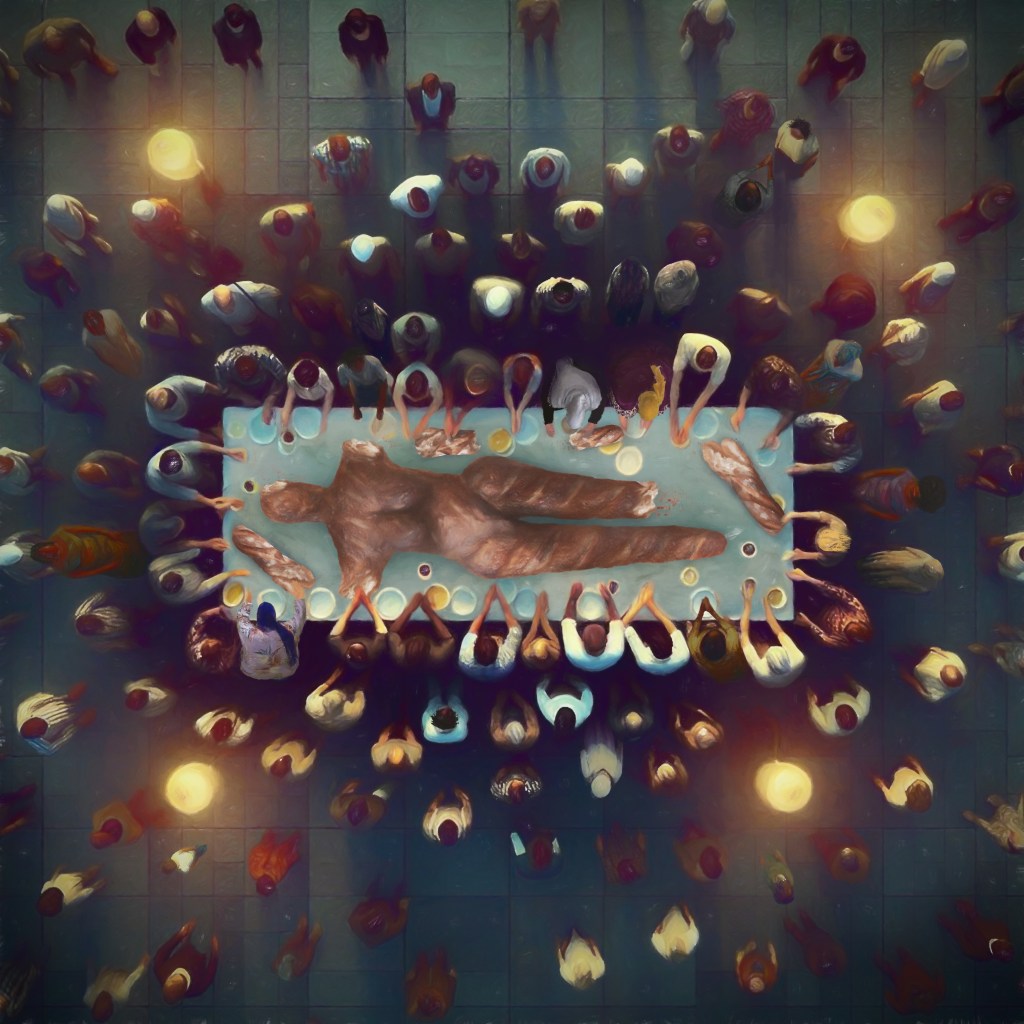 Högtiden består av ett bröd som bakas i en ugn i Holm gravfält strax efter lunch. Brödet hämtas upp av en båt och sicksackar sig över älven för att med brödets doft och skönhet välsigna folket som bor i Tybränn, Grillom, Skadom Boteå, Fanom vidare till Djuped, möter byborna från Torsåker som gått ner till Prästmon, Frök, Västhammar, Sandslån, Nyhamn och ner vidare till Björknäs och in i Kyrkviken för att lägga till vid Haga efter skymning. Här inväntar familjer och ensamma med spänning för att ta emot brödet och musikanter från bygderna runt om, spelar nyskrivna sånger för just det här årets ceremoni. Varje år utses en släkt för att bära brödet från strandkanten upp till torget för att där ta del av brödet. En hord av människor inväntar brödets ankomst på torget och fler musiker sluter upp till musikanternas spel. Det stora betonggjutna bordet som annars står tomt på torget bereder plats för brödet, i formen av en kvinnokropp i skala 1 till 1. Människorna flockar sig runt brödet och bryter av sin bit och stoppar i mun. Smaken av sur råg och fänkål fyller smaklökarna och magarna, för att förbli kraften, en välsignelse för kvinnan. Det är kväll och torget omges av levande facklor och öppna eldar. Kommunhuset är upptänt med kraftiga spotlight, människorna riktar sin uppmärksamhet mot kommunhuset och högst upp på kommunhusets tak står en kvinna och vill säga något. Något som hon hållit inne. Ett tag, ett liv, en, två, tre generationer. Hon håller en bit av brödet i handen, visar upp biten till människorna och avslöjar en hemlighet och befriar sig från den smärta som hållit henne som gisslan. Efter avslöjandet jublar människorna och en våg av applåder fyller luften i Kramfors centrum.