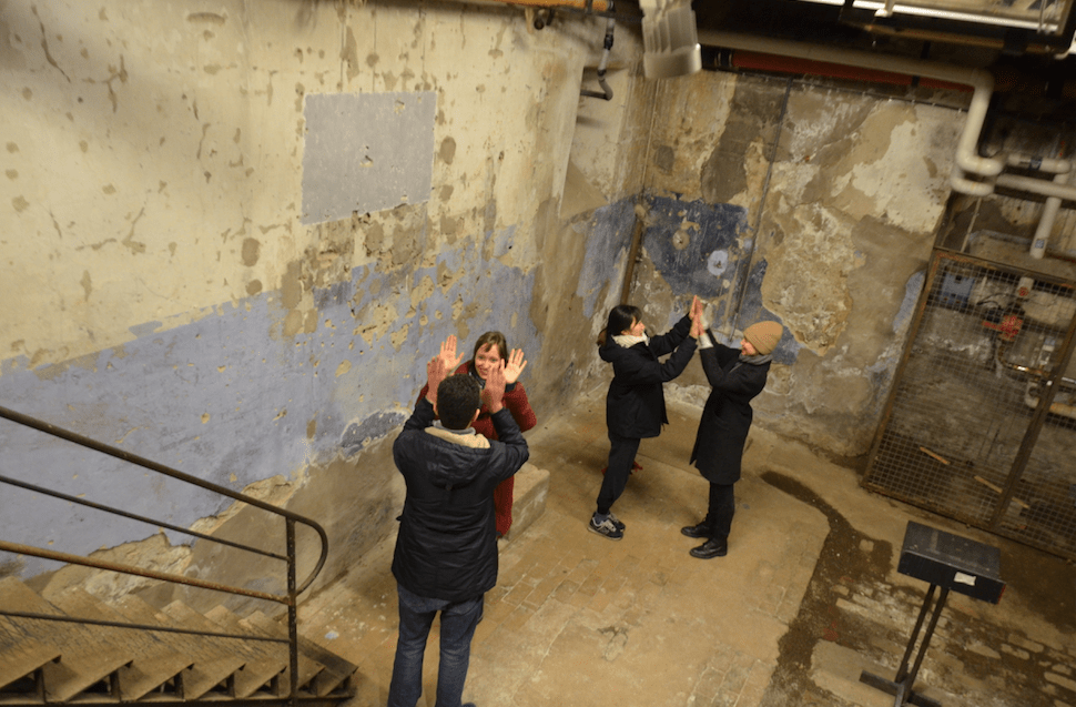 Det är ett rum med publik. Här blir de direkt deltagare av verket. Jag välkomnar de in till rummet. De hör min röst ur ett par högtalare som är placerade vid entrén. Jag ger de instruktionen: